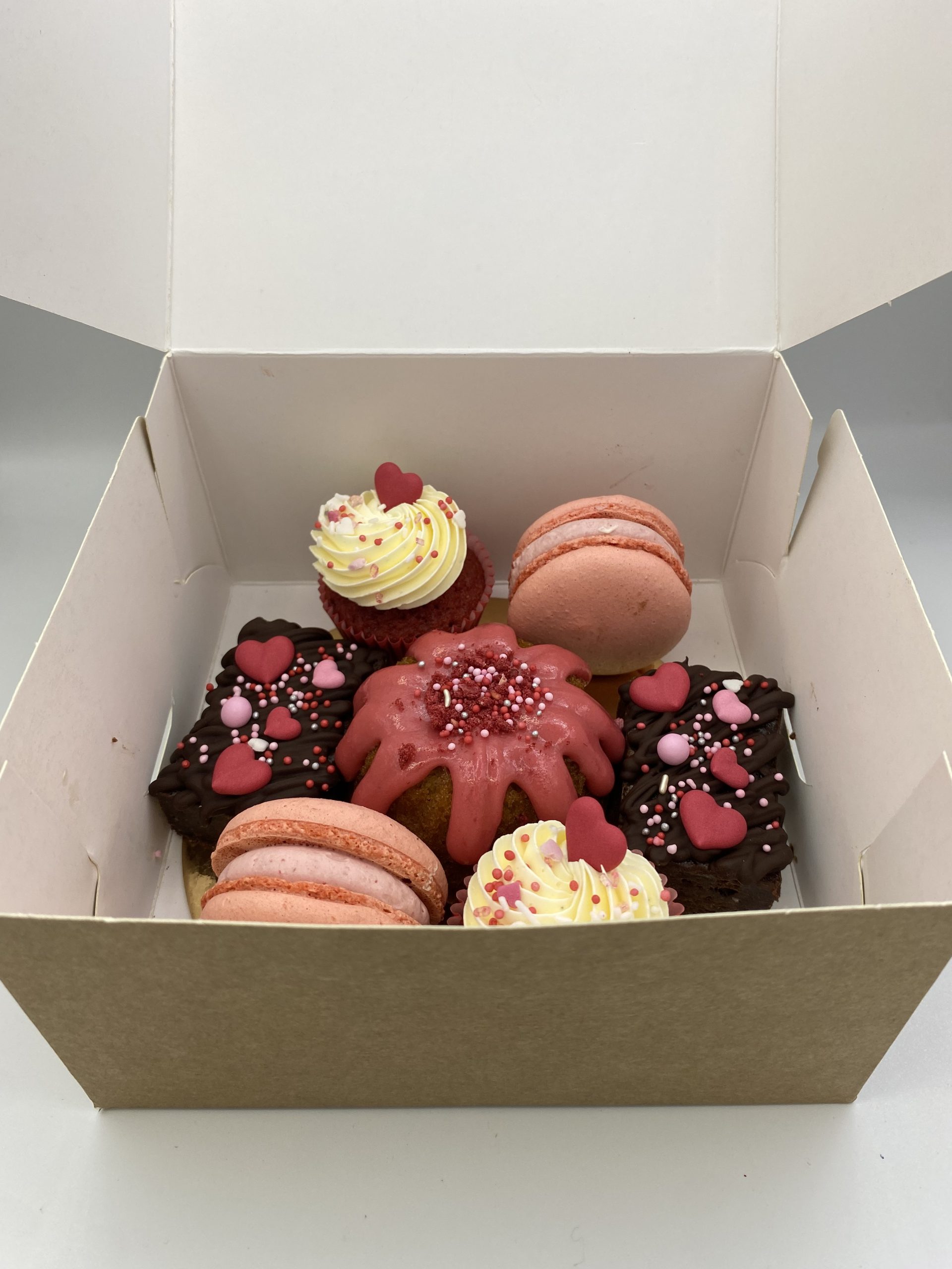 Verras je valentijn met dit romantische gebakjespakket voor 2 personen. In het doosje zitten vier verschillende heerlijke gebakjes, allemaal in valentijnssfeer gedecoreerd. Standaard krijg je een minicupcake, een macaron en een brownie per persoon en een cakeje om te delen.